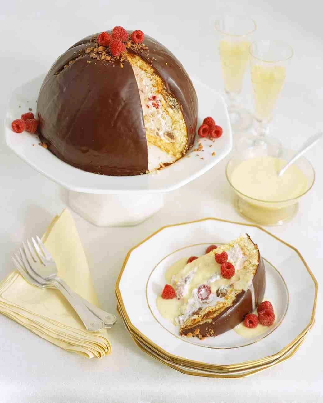 - Gotowe zuccotto wyjmujemy z miski na talerz, odwijamy z folii i polewamy roztopioną czekoladą.