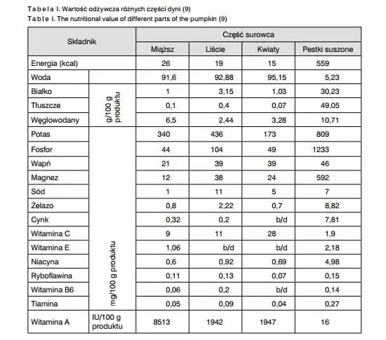 Tab.1 źródło: Bartosz Kulczyński, Magdalena Człapka-Matyasik, Anna Gramza-Michałowska. 2016. Wartość żywieniowa dyni. Bromat. Chem. Toksykol. – XLIX, 2016