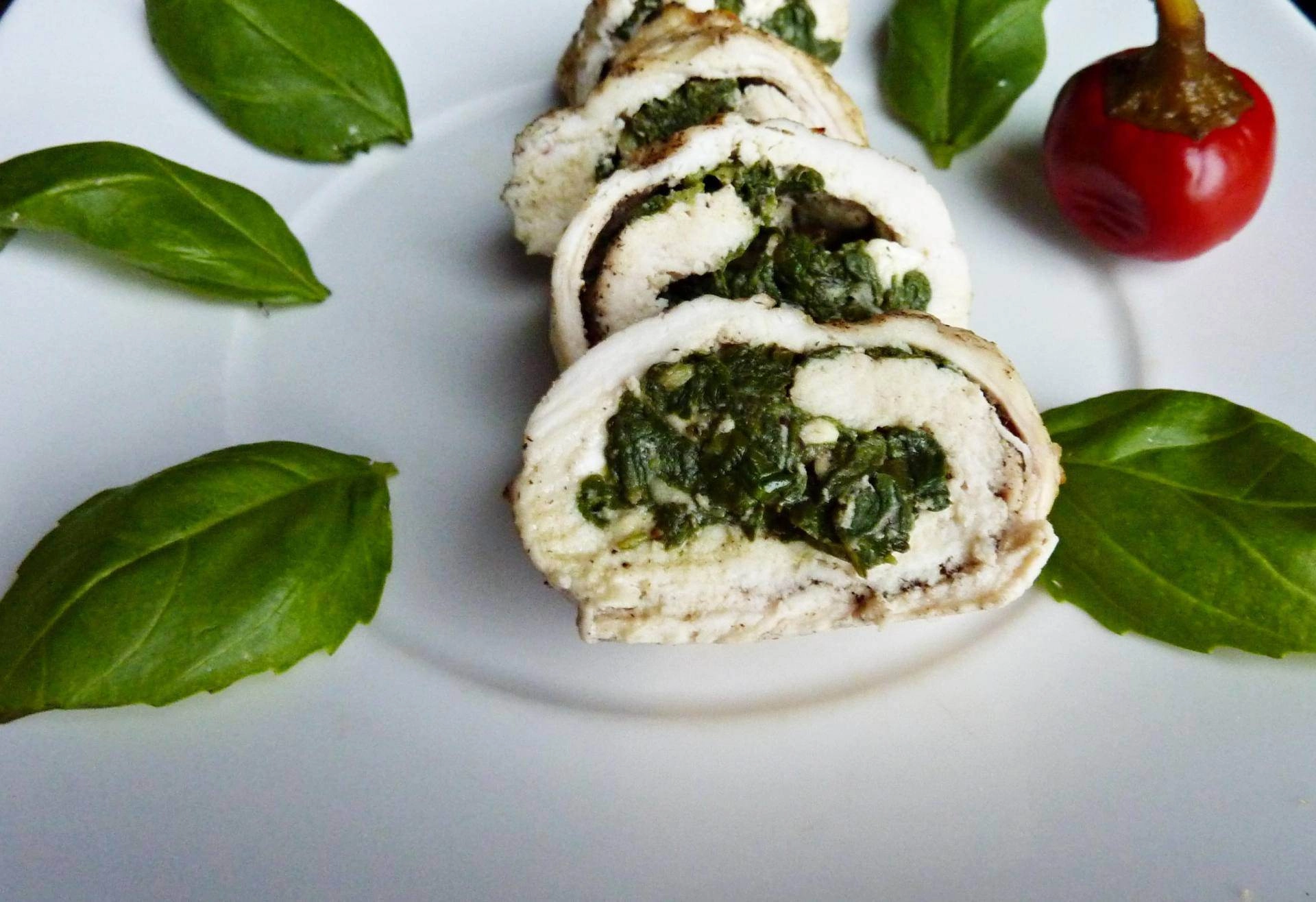 W rondelku rozpuścić masło, dodać szpinak, wyciśnięty przez praskę czosnek, jogurt naturalny, gałkę muszkatołową oraz pieprze. Smażyć około 3 minut, na koniec dodać pokruszony ser typu Feta. Pierś z kurczaka przekroić wzdłuż, a następnie rozbić, przyprawić szczyptą soli i pieprzem. Na mięso wyłożyć farsz, zwinąć w rulon (można spiąć wykałaczką). Na blaszkę wylać łyżkę oliwy, wyłożyć roladki. Piec około 30 minut w temperaturze 170 stopni.